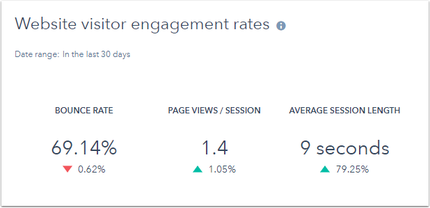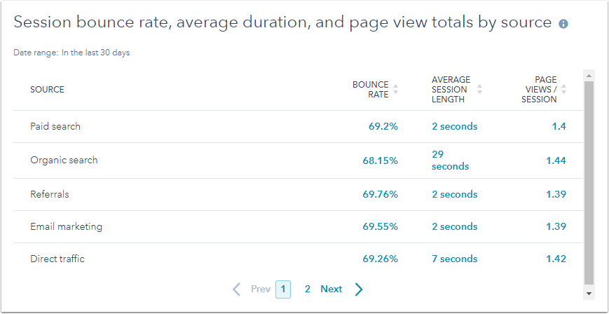 This report shows you the bounce rate, average session length, and page view per session, for each traffic source.