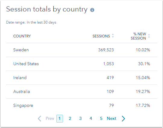 This report shows you the number of sessions and the percentage of new sessions to your website, per country.