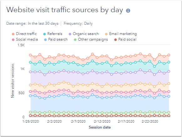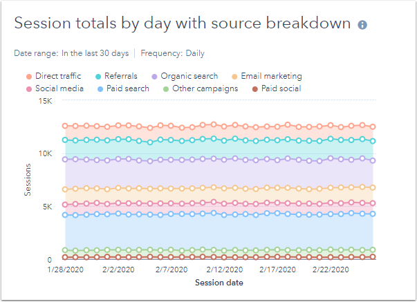 This report shows you the total number of sessions each day, and the traffic sources driving these sessions.