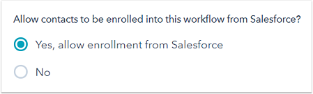 - Under Allow contacts to be enrolled into this workflow from Salesforce?, select Yes, allow enrollment from Salesforce.