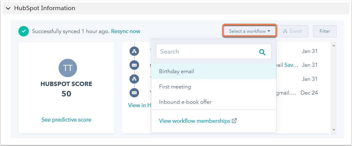 Please note: Marketing Hub Professional and Enterprise account users must have Workflows access in order to enroll Salesforce leads or contacts into HubSpot workflows directly from Salesforce.