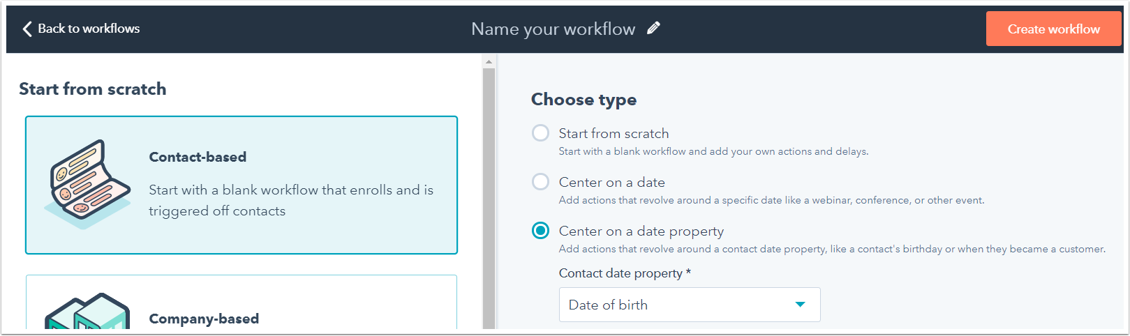 Please note: this article walks through creating Center on a date or Center on a date property contact-based workflows. Learn how to create standard, or Start from scratch contact-based workflows.