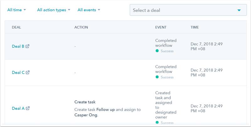 After creating your workflow and turning it on, you can view its history to see events that have occurred in the workflow. From the History page, you can also view the workflow version at the time of individual events.