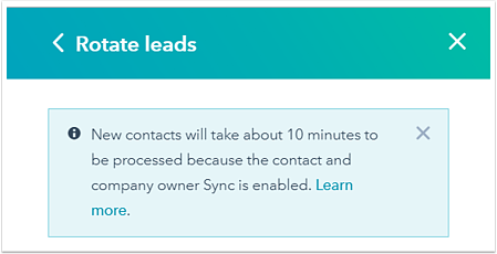 If the Assign company owner to contact by default setting is enabled, you'll see an alert when you add a Rotate leads action to a contact-based workflow: New contacts will take about 10 minutes to be processed because the contact and company owner sync is enabled.