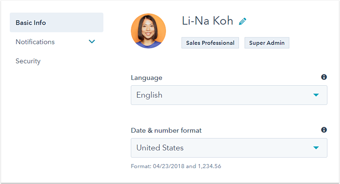 You can customize the time zone, language, currency, and date and number format of your account in HubSpot. If you are an account admin, you can set a default for these settings for all new users in your account. The language and date and number format settings can also be customized on a user-by-user basis.