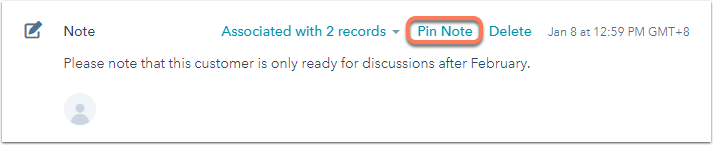 You can pin one note to the top of a contact, company, deal, or ticket record timeline. A pinned note will appear on the record timeline for all users in your account. There can only be one pinned one for each record.