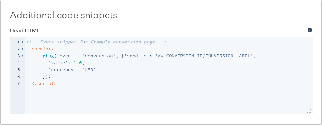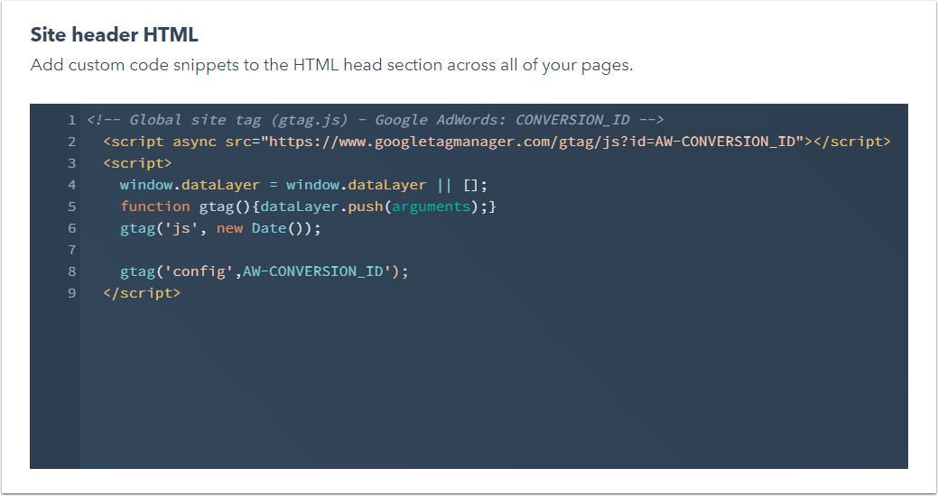 Scroll to the Site header HTML section and paste the global site tag snippet here. If you installed a global site tag on your website from another Google product (e.g., Google Analytics) or from another AdWords account, follow Google's documentation to adapt the tag so it works for your AdWords account.
