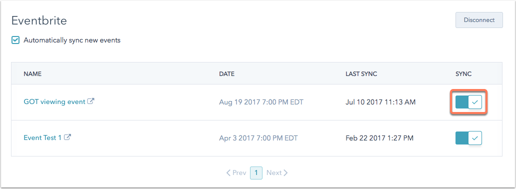 Any new events you create in Eventbrite will sync automatically. You can disable this option by unchecking the Automatically sync new events box on the Eventbrite settings screen in HubSpot. You can also disable syncing for any event at any time by toggling the Sync switch off.