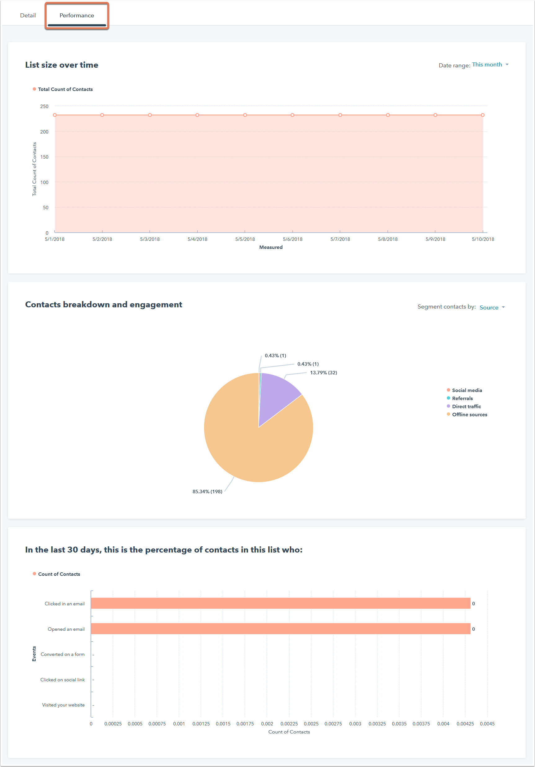 - In the last 30 days, this is the percentage of contacts in this list who: this shows the activity of your contacts in the list over the past 30 days. These activities include opened an email, clicked in an email, converted on a form, clicked on social link, and visited your website.