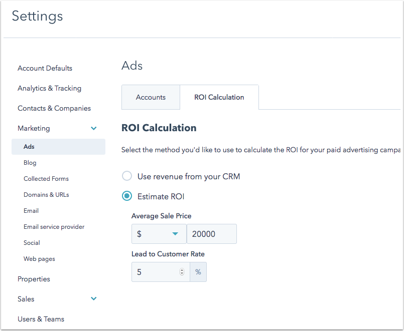 - Estimate ROI: with this option enabled, HubSpot estimates the ROI based on your average sale price and average lead to customer rate.