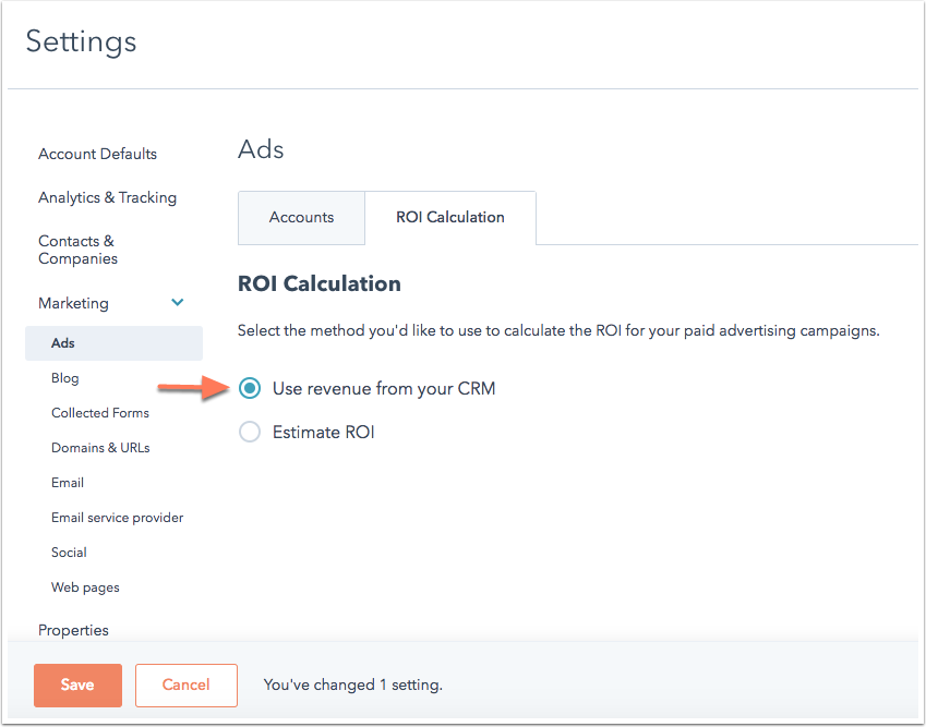 - Use revenue from your CRM: this setting calculates ROI based on your deals in HubSpot. With this setting enabled, deals marked as closed won will be included on your ads dashboard if they are associated with contacts in the lifecycle stage of customer who were attributed to your ad campaign. This option is recommended if you are using deals in HubSpot.