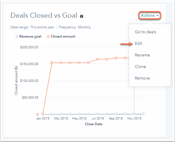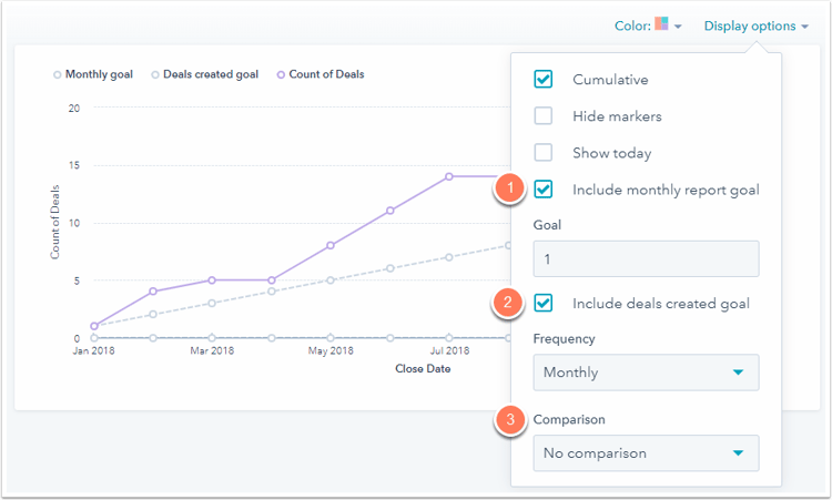 - Select Include [measurement] goal to compare current data with the existing goals you've set with the same measurement. The option name depends on the data you're measuring in the report. For example, measuring Amount will show a Include revenue goal option and measuring Count of deals will show a Include deals created goal option.