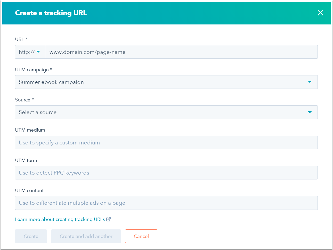 - When you're done, click Create, or Create and add another to create another tracking URL for the campaign.