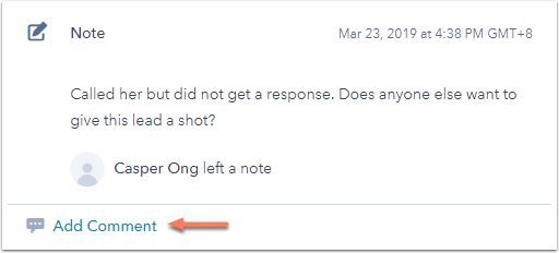 - At the bottom of the note, call, or logged activity, click Add comment.