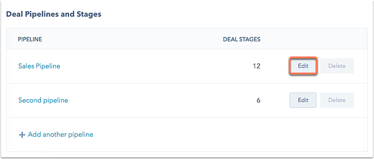 - In the Deal Pipelines and Stages section, click Edit next to the pipeline to customize the stages.