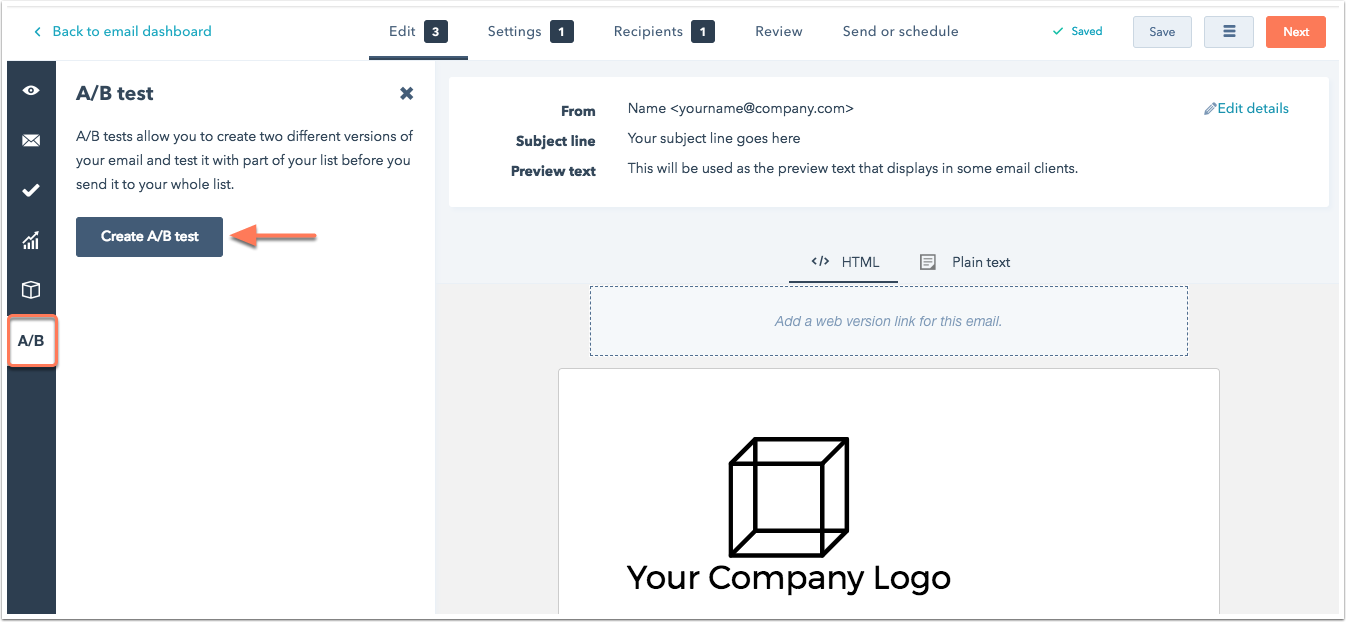 Please note: you won't be able to create an A/B test with an email that is saved for automation for your workflows.