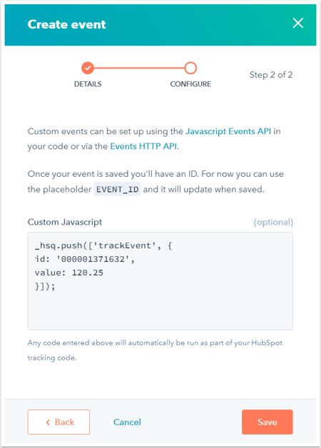 • If you're using custom JavaScript to trigger your event, enter the code into the Custom JavaScript field. Any code you enter in this field will automatically be included as part of your HubSpot tracking code. Learn more about the JavaScript Events API.