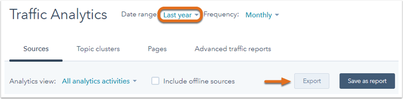 - Dans l’outil Analyse du trafic, cliquez sur l’onglet Sources, Groupes thématiques, Pages, ou Rapports de trafic avancés pour télécharger des données spécifiques sur le trafic.