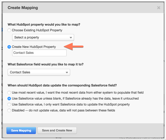 - Pour créer une nouvelle propriété de contact, sélectionnez Créer une nouvelle propriété HubSpot et attribuez-lui un nom. HubSpot mettra automatiquement en correspondance le type et les options de ce champ avec ceux de votre champ Salesforce.