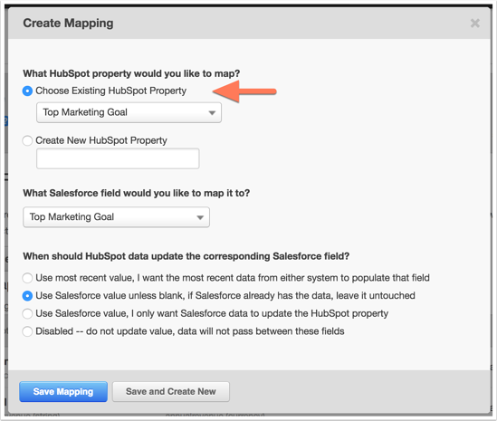 - Si la propriété existe déjà dans HubSpot, sélectionnez-la dans le menu déroulant Choisissez la propriété HubSpot existante.