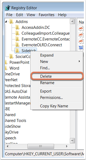 - Faites un clic droit sur le dossier Sidekick et sélectionnez Supprimer.