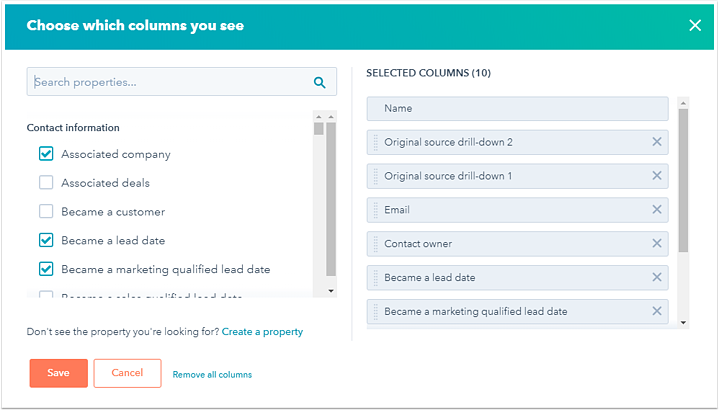 - Sélectionnez une propriété à ajouter à la section Colonnes sélectionnées. Dans la section Colonnes sélectionnées, cliquez sur les propriétés et faites-les glisser pour les réorganiser.