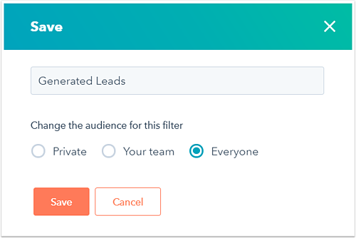 - Dans la boîte de dialogue, saisissez un nom pour le filtre enregistré et sélectionnez l'audience pour le filtre enregistré. Puis, cliquez sur Enregistrer.