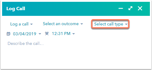 - Après avoir appelé un contact depuis HubSpot, cliquez sur le menu déroulant Sélectionner un type d'appel pour sélectionner le type d'appel.