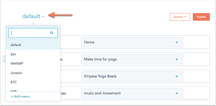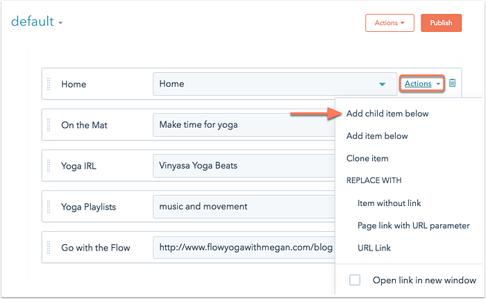 link : ajoute un autre élément à votre menu qui ne renvoie pas à une page existante. Ceci est souvent utilisé comme espace réservé pour les éléments de menu secondaire. - Ajouter un lien de page : ajoute un élément de menu qui renvoie à une page HubSpot spécifique.