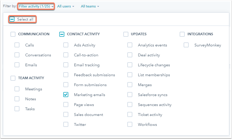 - Pour inclure un type d'activité sur la chronologie, cochez la case correspondante. Cochez la case Tout sélectionner pour sélectionner tous les types d'activité.