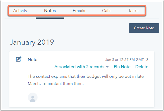 Pour un filtrage plus rapide, cliquez sur les onglets Notes, E-mails, Appels et Tâches dans le panneau du milieu pour voir uniquement les types d'activités respectifs.