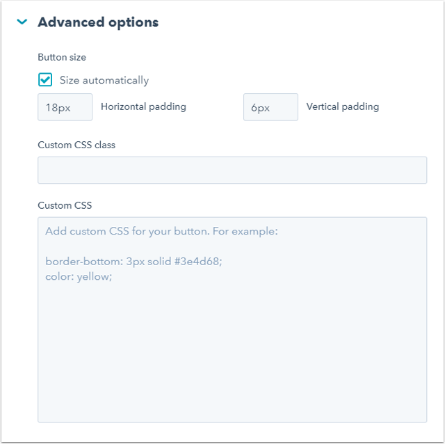- Si vous souhaitez ajouter une classe personnalisée à votre CTA, le champ CSS personnalisé prend en charge les entrées de classe personnalisées. Cela est utile lorsque plusieurs CTA sur les pages de site web doivent partager un ensemble similaire de caractéristiques de conception, telles que les familles de polices, la taille ou même le remplissage et les marges. Si vous utilisez une classe CSS personnalisée, assurez-vous que la classe est incluse et stylisée dans la feuille de style CSS appliquée comme étant le style principal de vos pages HubSpot.