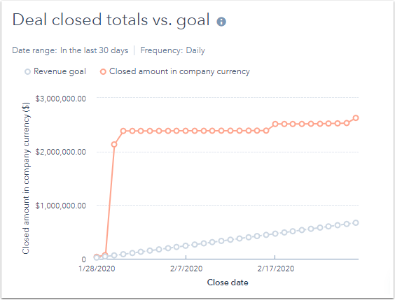 Ce rapport indique les revenus provenant de transactions conclues par rapport au quota de votre équipe ou à un objectif personnalisé. Vous pouvez utiliser ce rapport pour suivre les progrès de votre équipe dans le temps et fixer de meilleurs objectifs de vente. Ce rapport comprend les transactions terminées et conclues dans la période donnée.