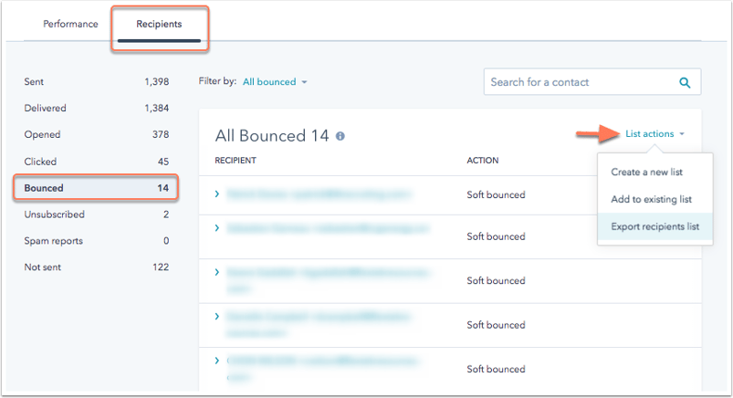 - Pour afficher les motifs de rejet en masse, cliquez sur le menu déroulant Actions de liste et sélectionnez Exporter la liste des destinataires.