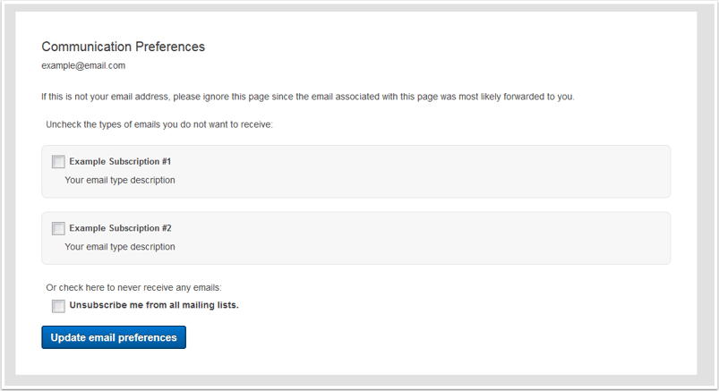 - Page de préférences d'abonnement : cette page fournit un nom et une description de chaque type d'abonnement défini dans vos paramètres d'e-mail. Les utilisateurs peuvent choisir le type de communication par e-mail qu’ils souhaitent que votre entreprise leur envoie. Ils peuvent également se désabonner complètement de votre liste de diffusion sur cette page.