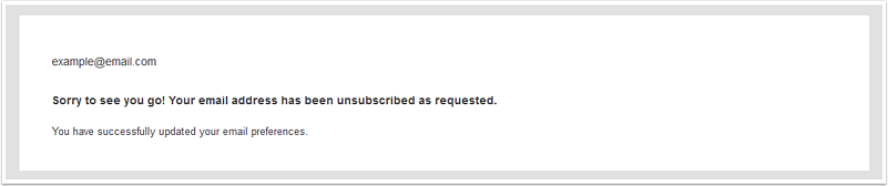 - Page de confirmation de mise à jour de l'abonnement : cette page confirme que HubSpot a reçu une demande de mise à jour des préférences de communication d'un visiteur. Elle s'affiche après qu'un utilisateur enregistre ses préférences sur la page de préférences d’abonnement ou après qu'il clique sur le lien Se désabonner de tous les e-mails à partir de l'e-mail qu'il a reçu.