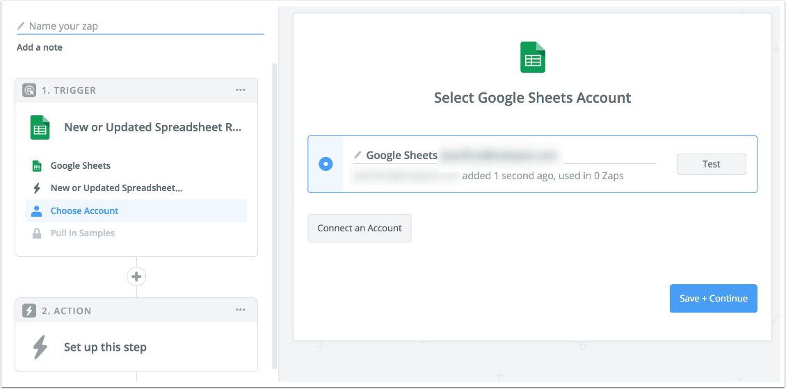 - Si vous n'avez jamais connecté votre compte Zapier à l'application sélectionnée, un message vous invitera à connecter votre compte. Puis, cliquez sur Enregistrer + Poursuivre.