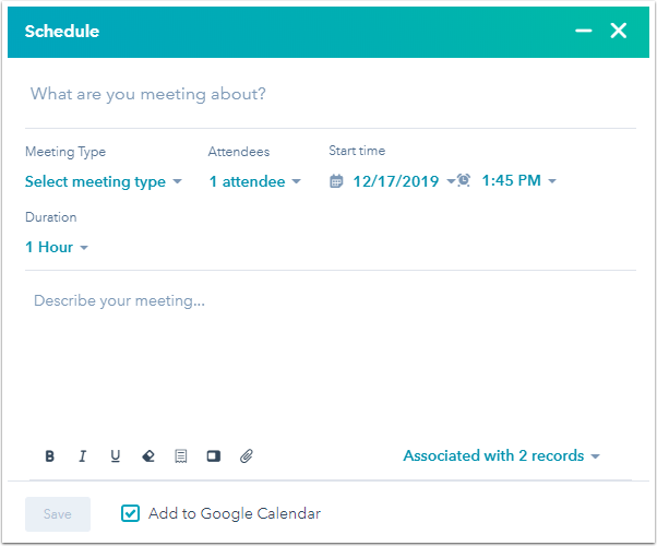 Remarque : Pour ajouter un lien Zoom ou UberConference à votre réunion, votre adresse e-mail d'utilisateur HubSpot doit correspondre à votre adresse e-mail Zoom ou UberConference.