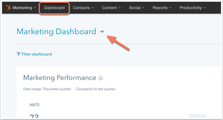 Note : si vous n’êtes pas un utilisateur Pro, Entreprise, ou Rapports, vous verrez uniquement le(s) tableau(x), de bord HubSpot standard(s) ici.