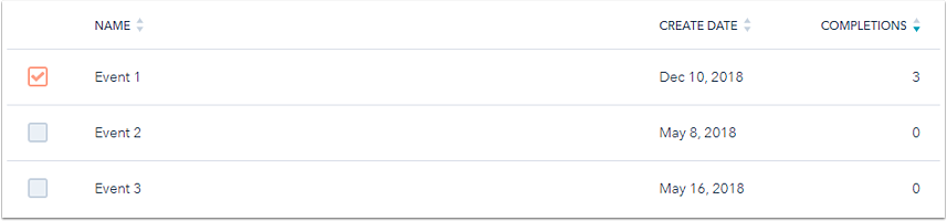 The table shows you the completions and create date of each event. To sort the data in the table, click the corresponding column header.