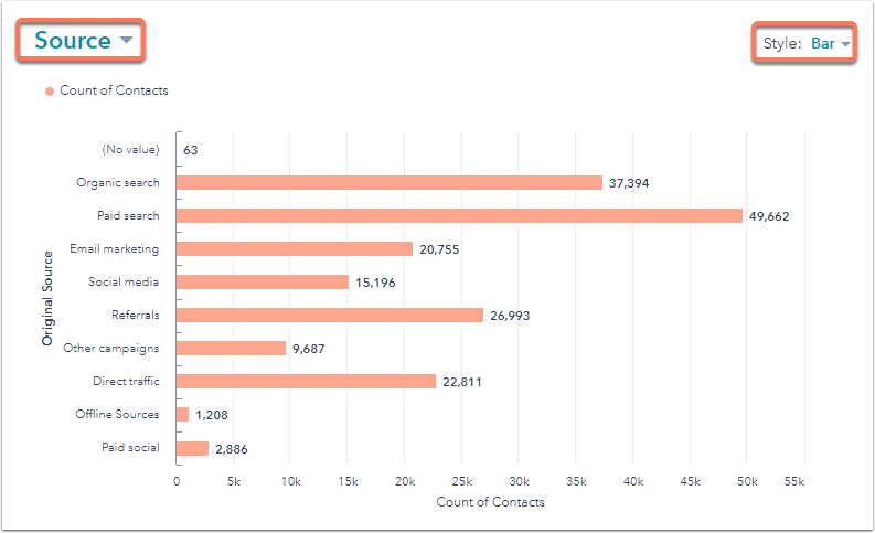 - Source: analyze the original source of your contacts. In the table view below, you can drill down into a specific source to see more details for each contact in your report.
