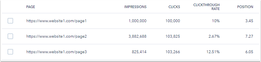 To analyze specific Google-indexed pages for your selected domain, on the SEO Page Analytics tab, view the table to see the metrics per content you have on your domain.