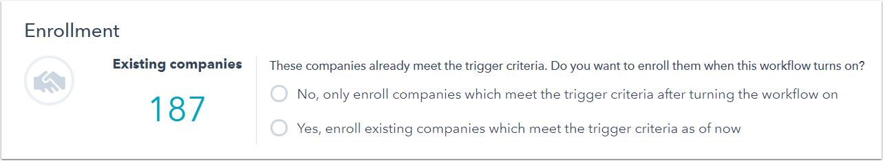 - To only enroll records that meet the enrollment triggers after the workflow is turned on, select No, only enroll [objects] which meet the trigger criteria after turning the workflow on.